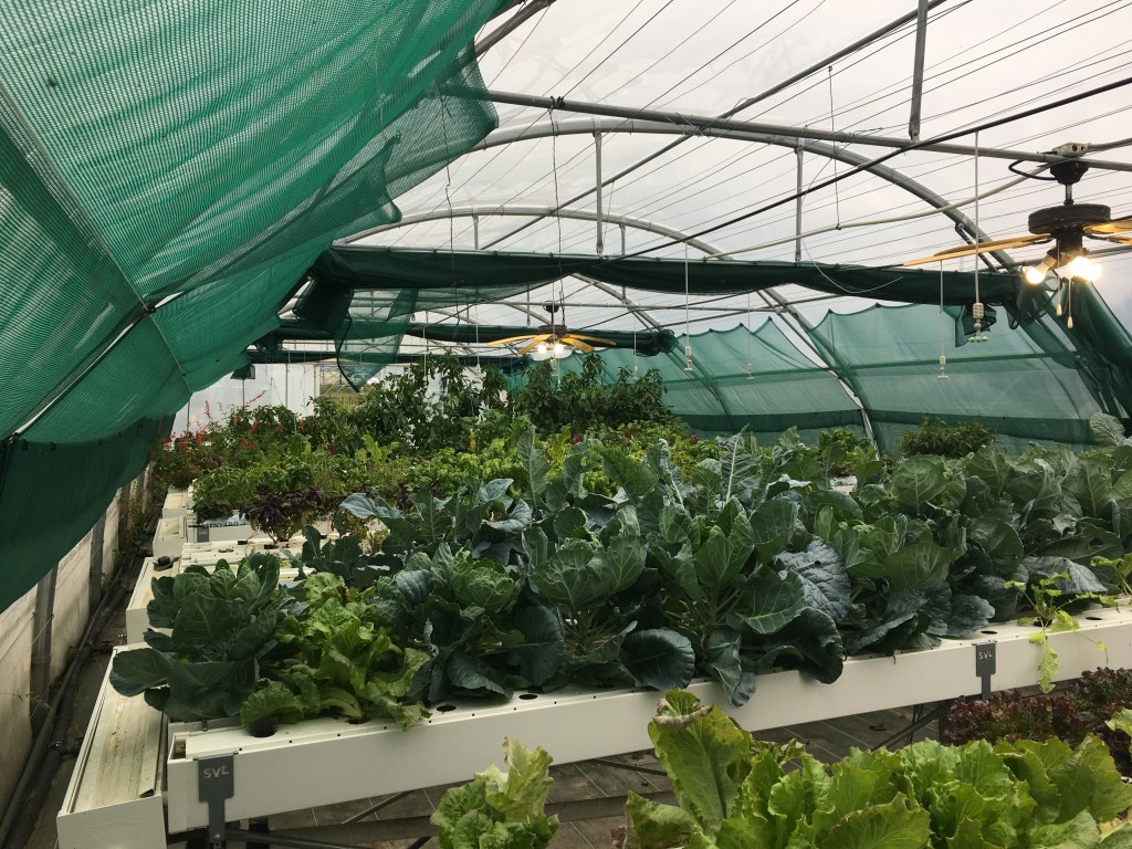 Et la partie végétale avec une production de plantes et légumes assez dense. En aquaponie, on peut tout cultiver. Cela fonctionne plus ou moins bien selon les espèces mais tout est possible (aujourd’hui, la ferme possède environ 30 espèces végétales différentes). Des espèces courantes (tomates, concombres, choux) aux espèces plus rares (plantes aromatiques, fleurs comestibles, gingembre).